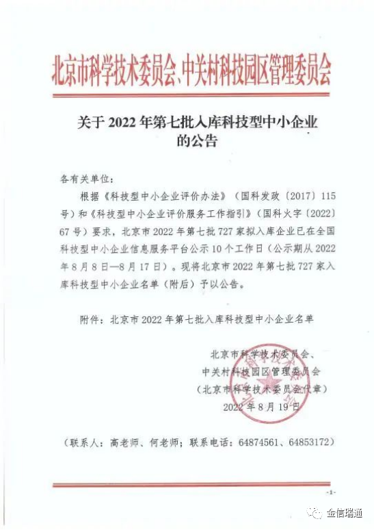 8月19日,北京市科學技術委員會、中關村科技園區管理委員會下發了《關于2022年第七批入庫科技型中小企業的公告》,對北京市2022年第七批727家擬入庫科技型中小企業通過公示企業名單予以公告。經審核,北京金信瑞通科技股份有限公司榜上有名,成功榮獲「科技型中小企業」認定!